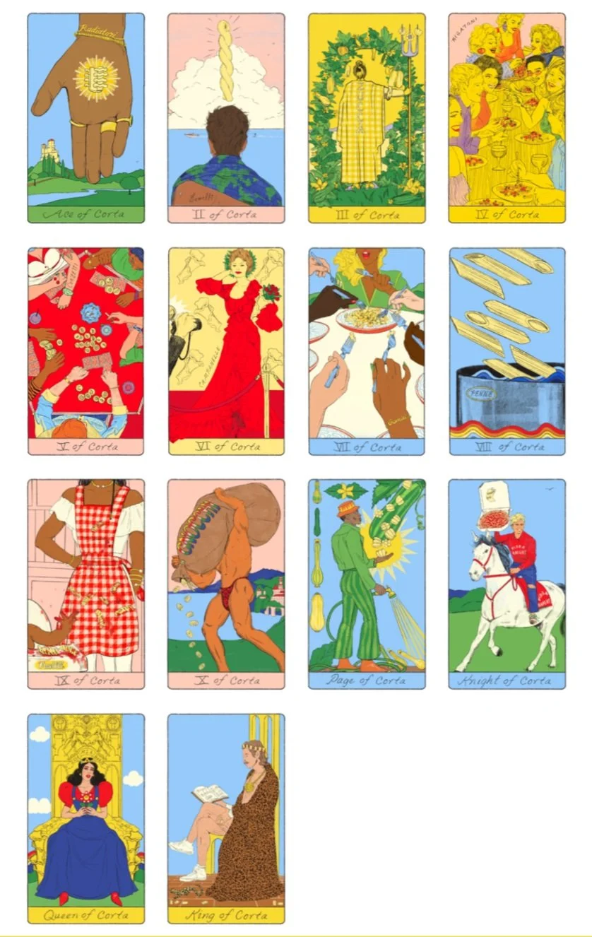 The Pasta Tarot: (78 cards, back design, booklet, box) Illustrated and designed by Lindsay Mound. Created by Jeff Petriello and Rob Truglia